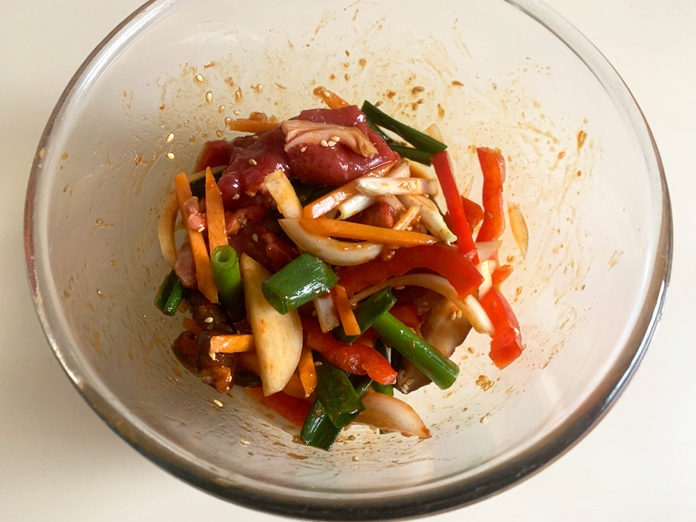 - Prepare Beef and Vegetables. Cut Vegetables into thin strips OR cut into 3-4cm long pieces. Add all ingredients to the Sauce, mix to combine, and set aside for 5 minutes.