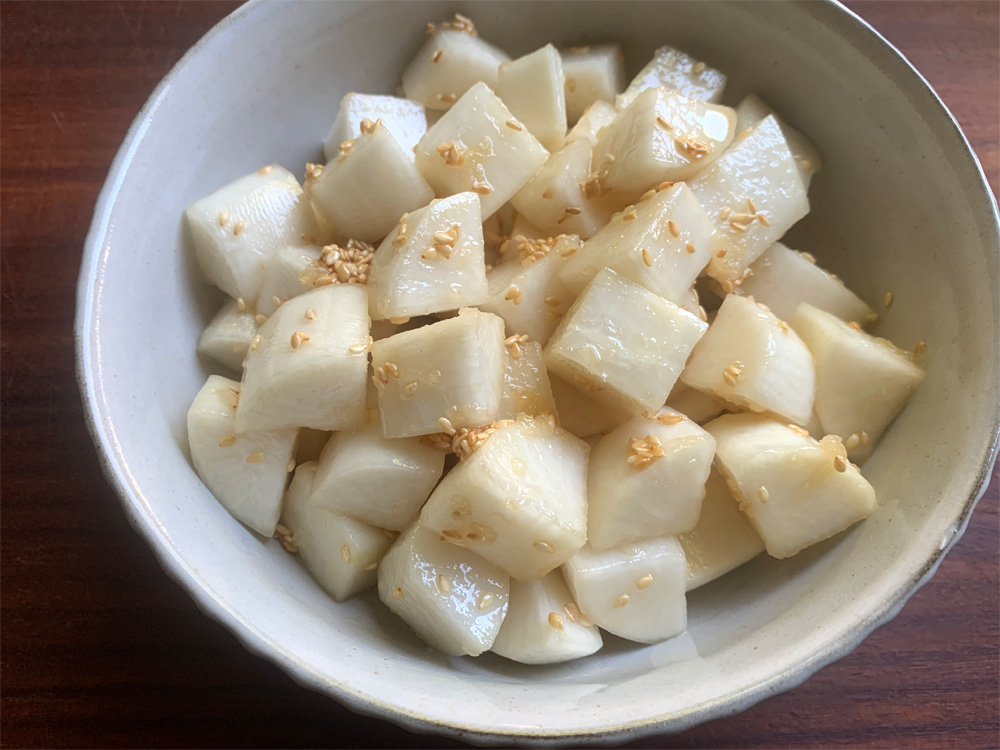 When I make a Namul, I most likely cut vegetables into thin strips. However, if you use Daikon, chunky pieces are also great for crunchy texture. I recommend to season this Namul not too strongly, but Salt is essential. 1 teaspoon Salt looks a lot, but you are not going to eat it all. If you happen to have Shiso (Perilla), it can be a good addition.