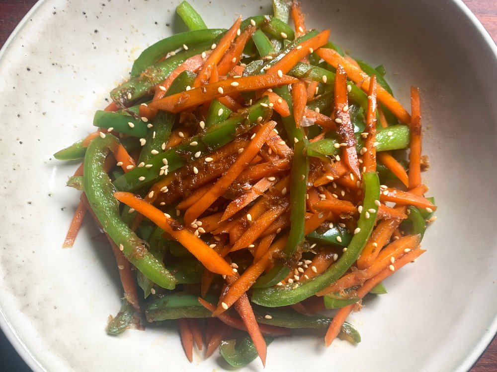 ‘Kimpira’ is a popular Japanese stir-fry dish, that is seasoned with Soy Sauce and Sugar, but I sometimes add Mirin OR Sake (Rice Wine) depending on the ingredients. A variety of vegetables can be used. One of my favourites is Japanese bell pepper called ‘ピーマン’ (Piiman). In Melbourne where I live, the substitute is small Green Capsicum. Today I added Carrot as well. And I always add ‘Katsuobushi’ (Bonito Flakes) to this dish.