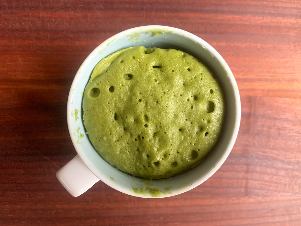 Today I craved a Matcha flavoured cake. If it is just for myself, the quickies and easiest option is a mug cake. I used Cream Cheese instead of Butter, but the flavour of the Cream Cheese was not strong. This cake is not very sweet, so enjoy it with Vanilla Ice Cream, Muscovado Syrup, Maple Syrup, etc.