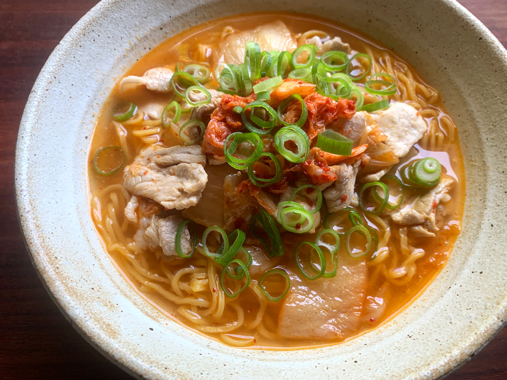 - Place some soup in a serving bowl, saving Pork, Spring Onion and Kimchi in the saucepan, drain the cooked Ramen Noodles and add to the soup, then place the remaining soup. Add some fresh Kimchi and finely chopped Spring Onion on top, and enjoy.