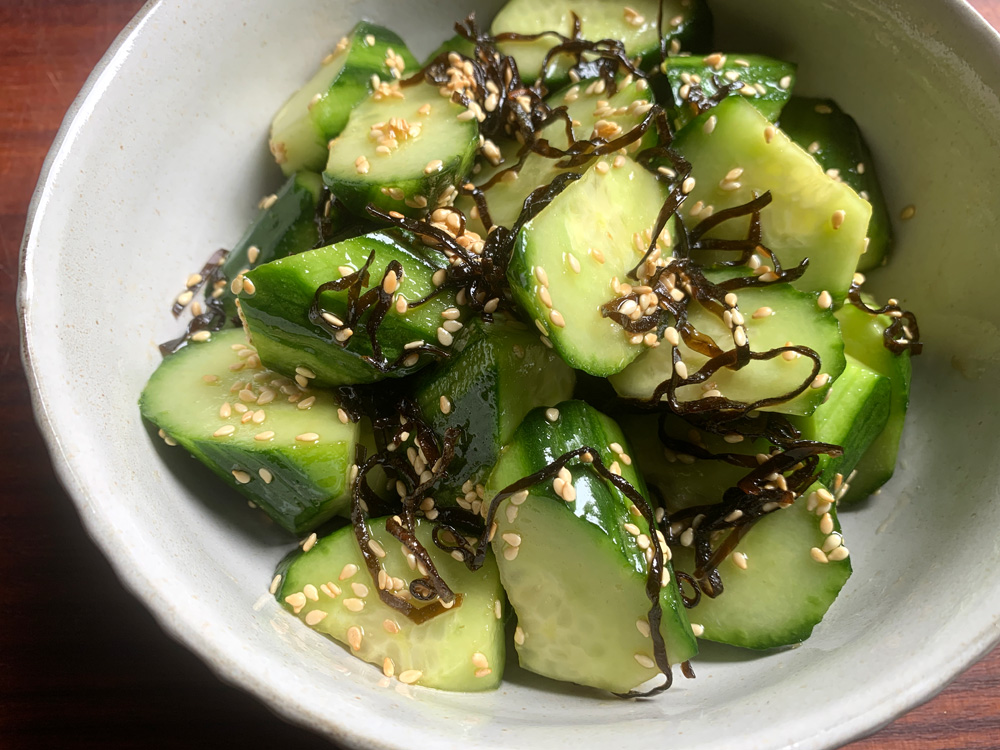 Seasoned Kombu (Kelp), that is often called ‘Shio Kombu’ (塩昆布) in Japanese, is very handy to have in the pantry. Because it is very strongly seasoned, it can be used as a seasoning. Today I just mixed it with Cucumber, and this yummy dish was ready to serve in a few minutes.