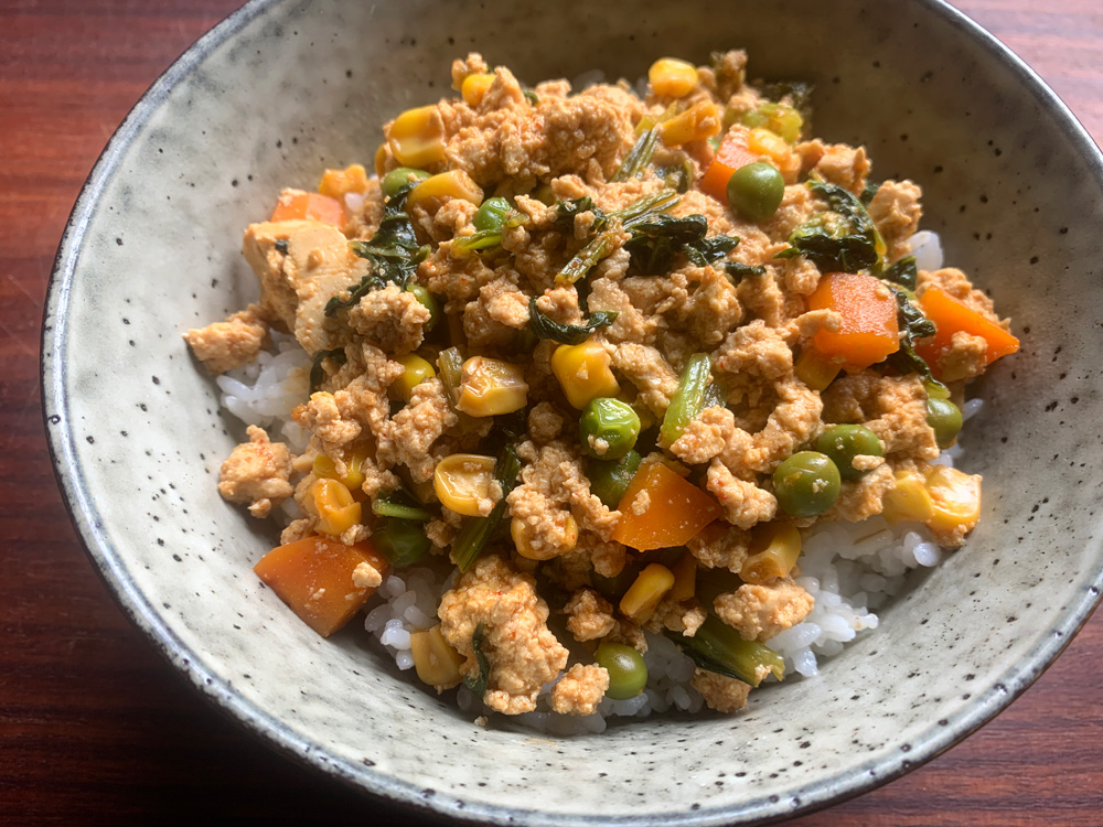 ‘Spicy Pork & Tofu Soboro Don’ is very popular among my family members, and I cook it very often. Today I tried to cook a Vegan version of it. I usually use Toban Djan (Chilli Bean Sauce) for the spiciness, but I used Gochujang (Korean Spicy Miso) today as it adds sweetness and Umami as well. You can use Toban Djan OR other Chilli Sauce, and alter the amount of Sugar.