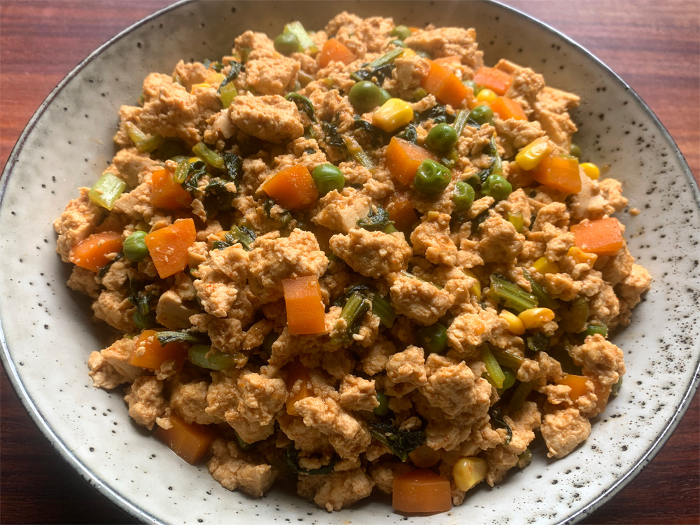 - When the vegetables are softened, add the Sauce, and bring to the boil. Add the crumbled Tofu, and stir until the sauce is thickened OR almost gone.